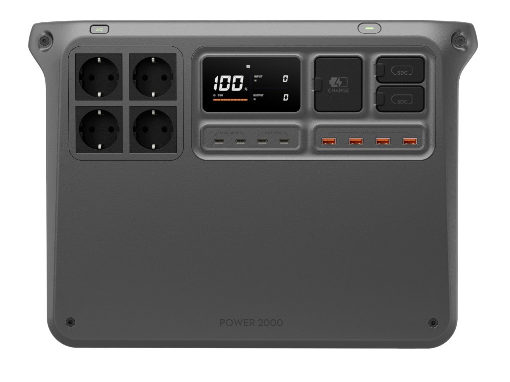 Power 2000 ponúka duálne 140 W USB-C porty, duálne 65 W USB-C porty, štyri USB-A porty, štyri AC zásuvky, dva plnohodnotné SDC porty a dva 1/4" závity, čo umožňuje pripojiť širokú škálu príslušenstva DJI Power, solárnych panelov, napájacích a adaptérovcých káblov podľa potreby.